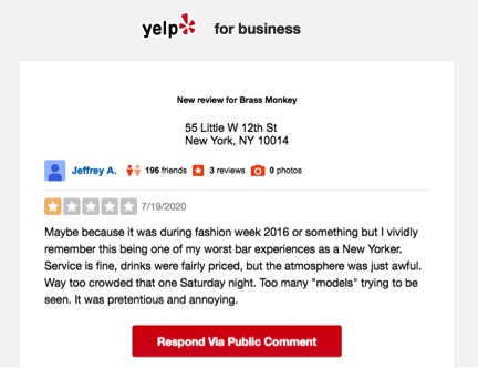 And then, sometime around 1:55 p.m., you decided to leave a Yelp review about a place you visited one time four years ago. Maybe you were talking to someone on the phone and you were reminiscing about Fashion Week 2016 because you saw something that reminded you of the Valentino show with the sparkly silver numbers. Or maybe you did go for a walk and you happened by the Meatpacking District and saw my business. You would have seen that it is currently still boarded up and empty as we have been for four months now. Maybe seeing that bright red awning made you recall a night – your “worst bar experience ever.” Whatever the reason, you decided that it was so important that you just had to leave your third ever Yelp review today.